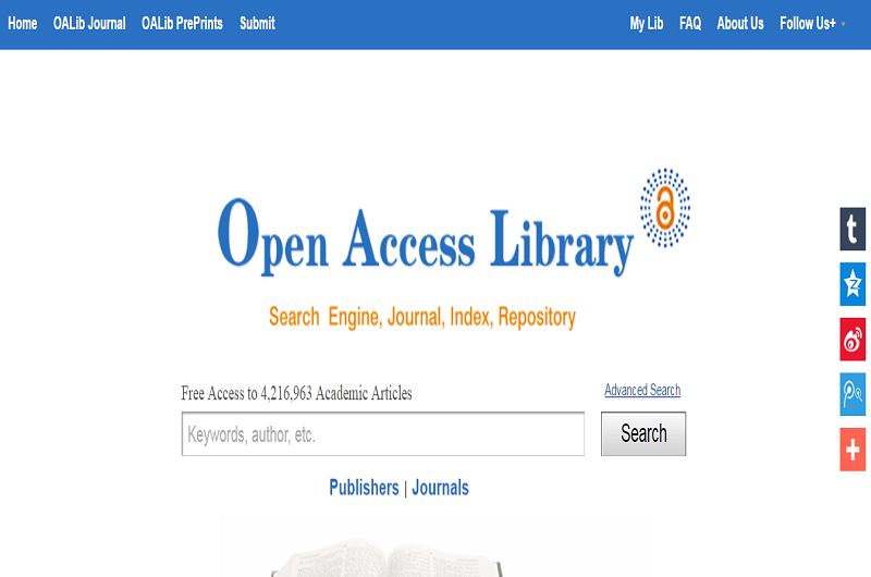 Open Access Library即開放存取資源圖書館,致力於為學術研究者提供全面、及時、優質的免費閱讀科技論文,同時也作為一個開源論文的發佈平臺,為更多的優質論文提供第一時間發佈的機會。目前已經有數百萬篇免註冊、免費使用下載的英文期刊論文,這些論文大部分來自國際知名的出版機構,領域涵蓋數學、物理、化學、人文、工程、生物、材料、醫學和人文科學等領域。同時,OALIB也在不斷努力增加論文數量,讓更多的免註冊、免費用的文章可以加入OALIB,使更多的學者從中受益。
